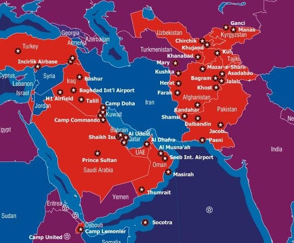 Jak vidno z níže položeného obrázku, USA má pod svoji kontrolou prakticky všechny země v okolí Íránu. Írán je tak v podstatě obklíčen a v případě napadení ze strany nebude schopen čelit útokům ze všech stran. Chystá se tak cosi ve stylu Blitzkrieg a to hlavně proto, aby byly minimalizovány škody, které Írán způsobí po svém napadení. Zejména se pak uskupení NATO (čti.: bojovníků za NWO) bojí, že Írán po útoku zasype Izrael salvou stovek konvenčních raket.