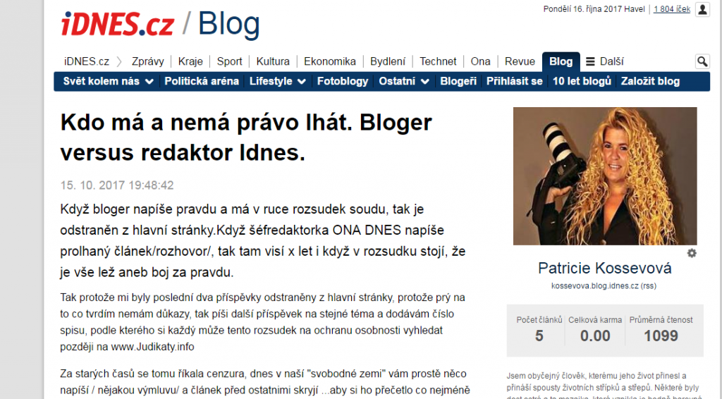 Administrátor mi napsal, že pro své tvrzení nemám žádný důkaz ......rozsudek soudu, tedy pro IDNES nic neznamená ....nebo ho raději chtějí spíše přehlížet, aby se lidé nedozvěděli, jak jejich médium porušuje zákon ... ráda bych rozsudek připojila ke svému blogu, ale v rubrice společnost to nelze / jde to v dalších rubrikách jako je vaření ...cestování/