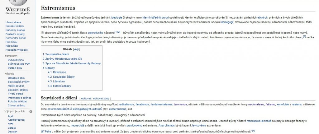 Když se podíváme do Wikipedie, tak "Extremismus je termín, jímž bývají označovány jednání, ideologie či skupiny mimo hlavní (střední) proud společnosti, kterým je připisováno porušování či neuznávání základních etických, právních a jiných důležitých společenských standardů, zejména ve spojení s verbální nebo fyzickou agresivitou, násilím nebo hrozbou násilí, historickým revizionismem, sociální demagogií, motivované zejména rasovou, národnostní, náboženskou, třídní nebo jinou sociální nenávistí."