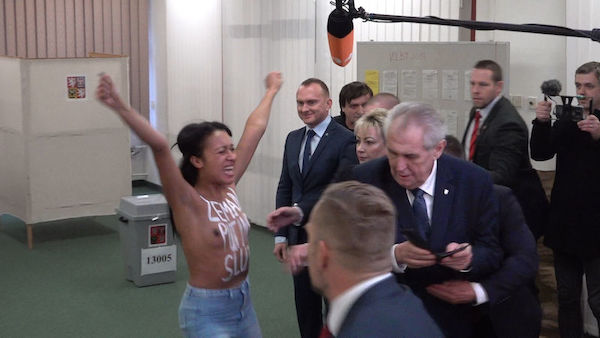 Velmi nečekaná „událost“ potkala prezidenta Zemana během jeho návštěvy volební místnosti. Ve chvíli, kdy vytahoval z peněženky občanský průkaz, vyběhla zpoza sloupu polonahá ukrajinská extremistka z hnutí Femen a vrhla se na prezidenta. Ochranka okamžitě zakročila, hlavu státu ochránila a ženu hodila na zem a zpacifikovala. Nyní už ji mají v rukou pražští policisté.