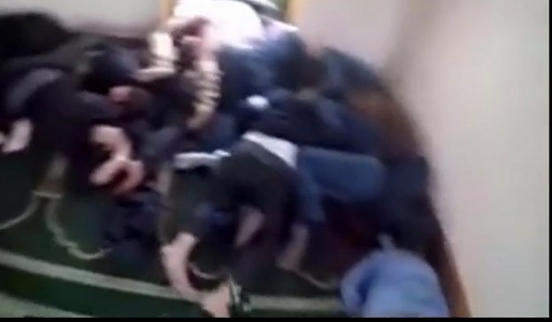 7:32 Tarrant byl v mešitě střílet již dvakrát (podruhé se vrátil po výměně zásobníků v chodbě) ve velké místnosti, kde vystřílel minimálně šedesát nábojů do „těl“ v obou rozích místnosti.