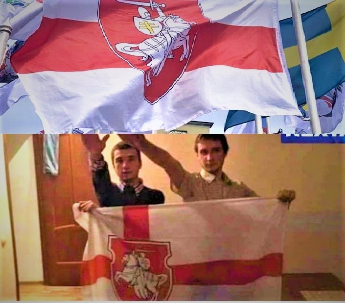 Níže na obrázku opoziční novinář, vlastenec a nenácek Roman Protaševič s kolegou z AZOVa odhání od vlajky "běloruské opozice" mouchy, aby jí nepokálely.