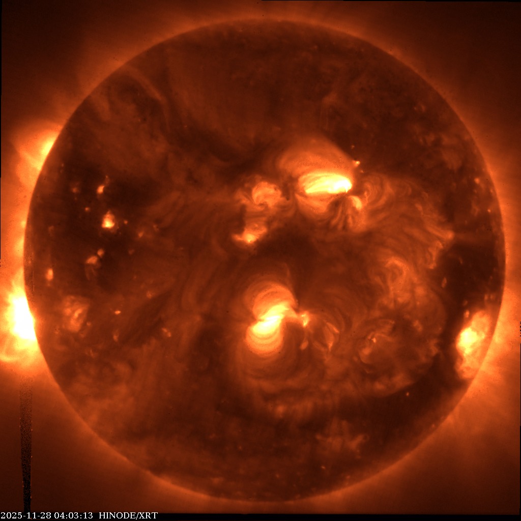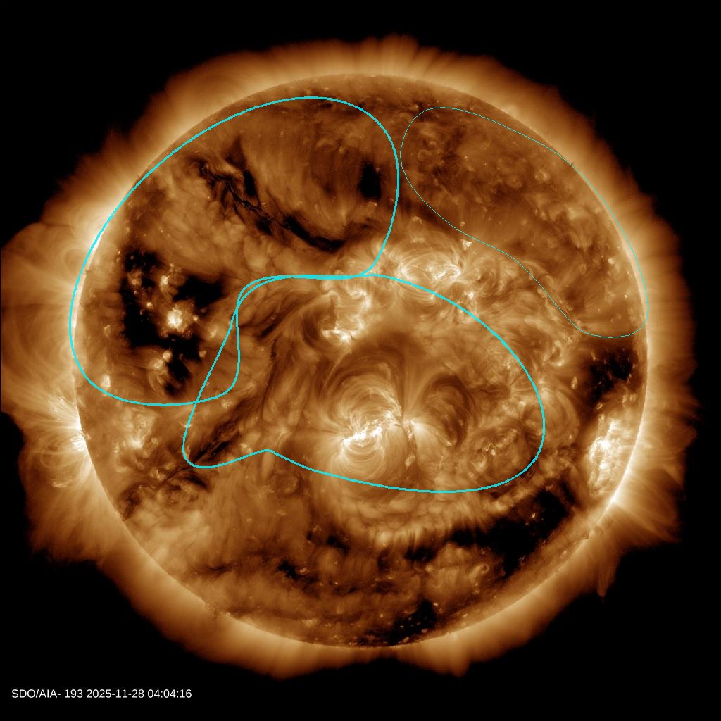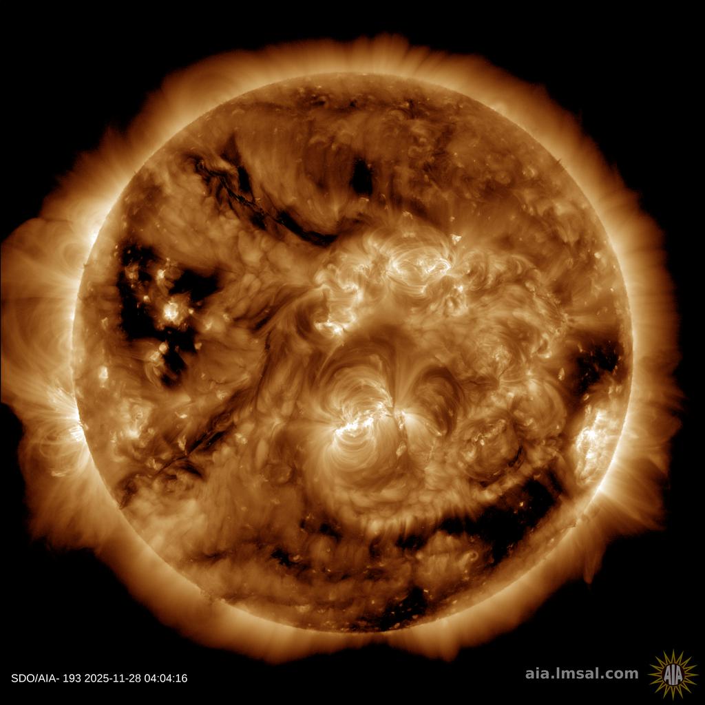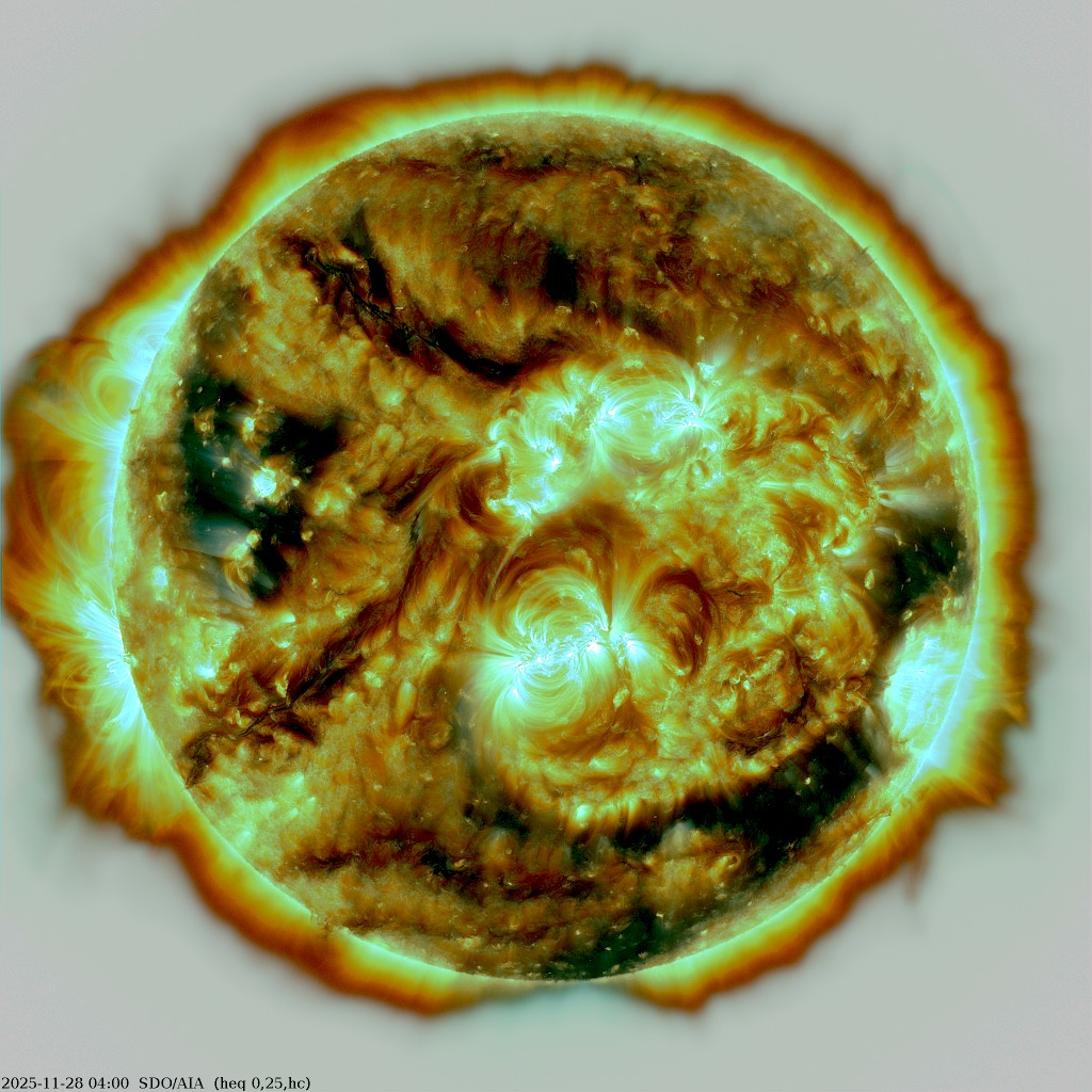(Sluneční ultra-fialová oblaka nejsou vidět odtud dole ze Země, protože ozonová vrstva toto extra-ultra-fialové (EUV) záření stíní...)
