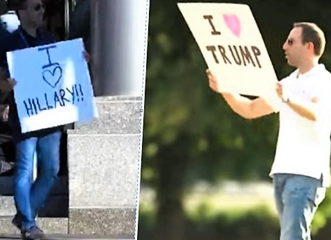 Satirik Ami Horowitz se vydal s plakátem „I love Hillary“ na místo, kam zrovna přilétal Donald Trump, tedy mezi příznivce republikánského kandidáta. To samé pak udělal naopak, vzal si plakát „I love Trump“ a vydal se mezi příznivce Hillary Clinton. Výsledek ve videu níže: