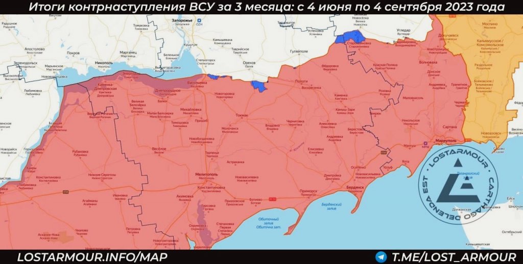 Mapa zobrazuje stav - postup ukrajinské armády od 4 června 2023 do 4 září 2023 !!!