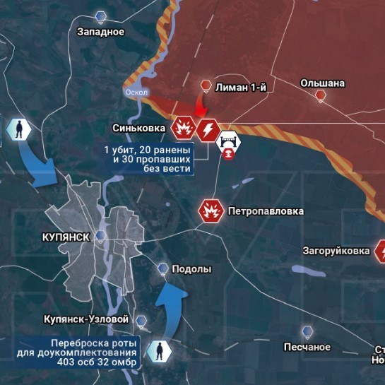 V průběhu několikatýdenního systematického postupu do hloubky obrany ukrajinské armády u Kupjanska vyřadili vojáci skupiny "Západ" Ozbrojených sil RF ukrajinské nacisty z několika opěrných bodů jižně a jihozápadně od Limanu 1 a vstoupili do obce Sinkovka.
