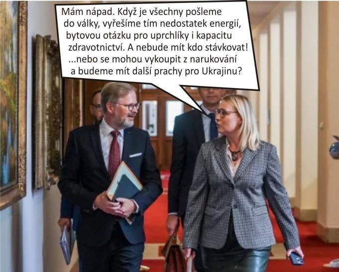 Podobně naivní jsou lidé dnes – obyčejní občané, kteří si nebezpečí války nechtějí připustit, stejně jako politici, kteří dokonce válku připravují. Všichni si myslí, že válka bude rychlá, bezbolestná, že se nás vůbec nedotkne. Nejnovějším příkladem naprosté odtrženosti od reality (nebo spíše: příkladem idiocie) je výrok ministryně obrany, že Češi by použití taktických jaderných zbraní na Ukrajině ani nepocítili a nijak by nás tyto zbraně neohrozily. Prý jí to řekla její kamarádka Dana. Je neštěstím České republiky, že tato ženská, která by měla stát za plotnou, řídí českou armádu.